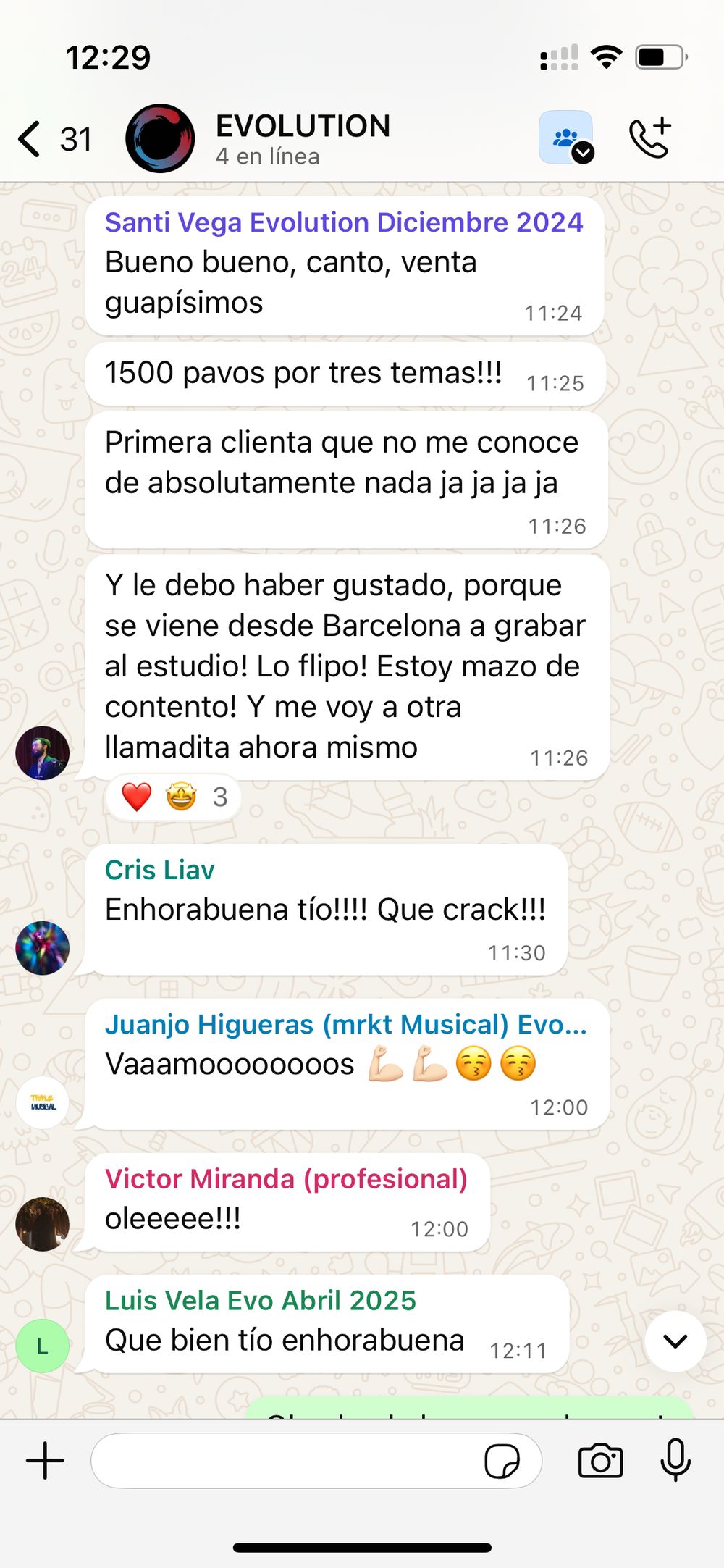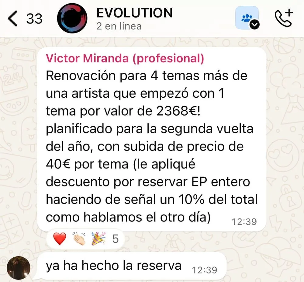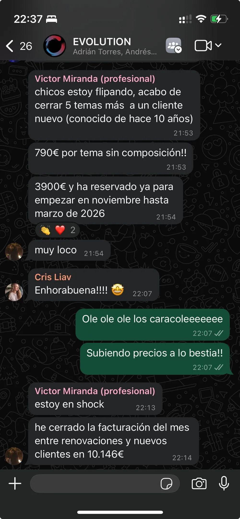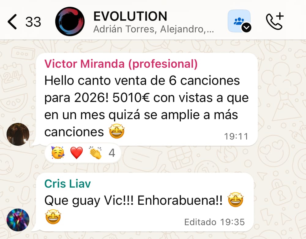Es el mayor caso de éxito dentro de Evolution, habiendo hecho 19.700€ en un solo mes con su negocio musical. Es en una de las mayores referentes del derecho musical Hispano.